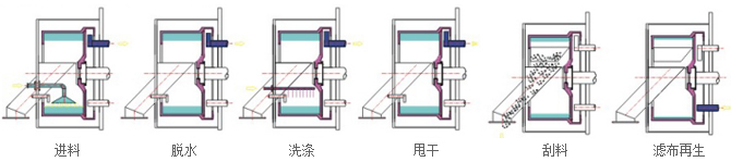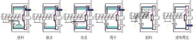 電機帶動皮帶輪驅(qū)動轉(zhuǎn)鼓繞自身軸線高速回轉(zhuǎn),反沖管向虹吸室內(nèi)灌液排除虹吸管內(nèi)的空氣,物料在預先編制的程序控制下,通過進料系統(tǒng)進入高速旋轉(zhuǎn)的轉(zhuǎn)鼓內(nèi)。在離心力和虹吸抽離的雙重作用下,物料均布在過濾介質(zhì)上進行脫液分離,液相透過固相物料和濾網(wǎng)縫隙,經(jīng)過濾內(nèi)轉(zhuǎn)鼓壁孔和虹吸室的通孔進入虹吸室,再由虹吸管抽走排出機外,固相物料截留在過濾轉(zhuǎn)鼓內(nèi)形成濾餅。料層檢測裝置實時檢測物料的充填位置,當濾餅達到事先設定的位置時,自動關閉加料閥,停止進料,然后對濾餅進行洗滌、脫水,待達到要求后,離心機降到卸料速度,卸料閥打開,刮料器在液動控制下旋轉(zhuǎn)上升,將濾餅刮下掉進螺旋出料器,經(jīng)出料閥排出機外。