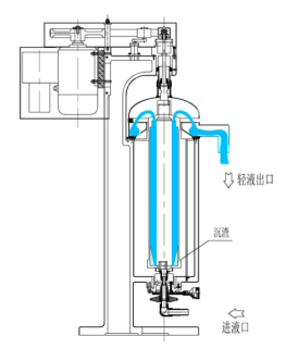 主軸帶動(dòng)轉(zhuǎn)鼓繞自身軸線高速旋轉(zhuǎn),在轉(zhuǎn)鼓內(nèi)形成強(qiáng)大的離心力場。物料由底部進(jìn)料口進(jìn)入轉(zhuǎn)鼓內(nèi),在離心力作用下,迫使物料沿轉(zhuǎn)鼓內(nèi)壁向上流動(dòng)。質(zhì)量輕的液體經(jīng)轉(zhuǎn)鼓上部排液口排出,通過集液盤回收;質(zhì)量重的固體沉積在轉(zhuǎn)鼓內(nèi)壁上,形成沉渣層,停機(jī)后人工清除。